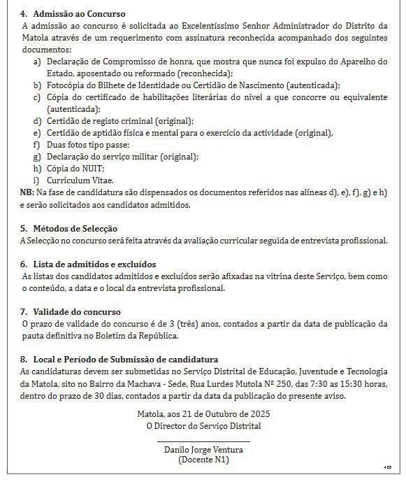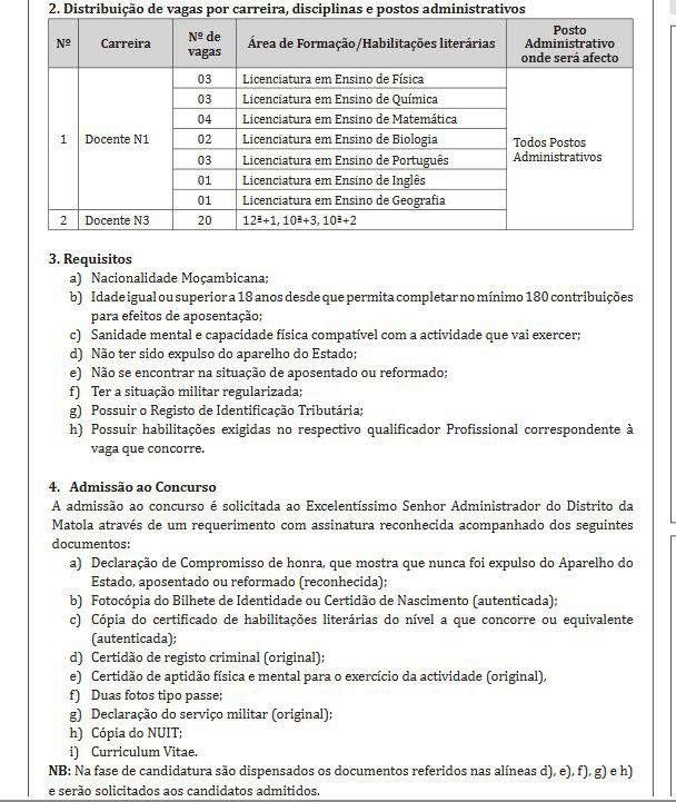 1. Por Despacho de 20 de Outubro de 2025, do Excelentíssimo Senhor Administrador do Distrito da Matola, torna-se público que está aberto o concurso de ingresso no Aparelho de Estado para substituição, para o provimento de 37 vagas, sendo: Dezassete (17) na carreira de Docente N1 e Vinte (20) na carreira de Docente N3, existentes no Serviço Distrital de Educação, Juventude e Tecnologia da Matola, nos termos do n.º 1 do artigo 34 do Estatuto Geral dos Funcionários e Agentes do Estado, aprovado pela Lei n.º 4/2022, de 11 de Fevereiro conjugado com o artigo 1 do Decreto n.º 30/2018, de 22 de Maio e a Resolução n.º 8/2002, de 22 de Maio, em observância ao preceituado no Diploma Ministerial n.º 88/2005, de 28 de Abril, que aprova o regulamento de concurso para as carreiras de regime especial da educação e o Diploma Ministerial n.º 61/2000, de 5 de Julho, que aprova o regulamento de concursos nas carreiras de regime geral e especial da área comum do Aparelho do Estado.
