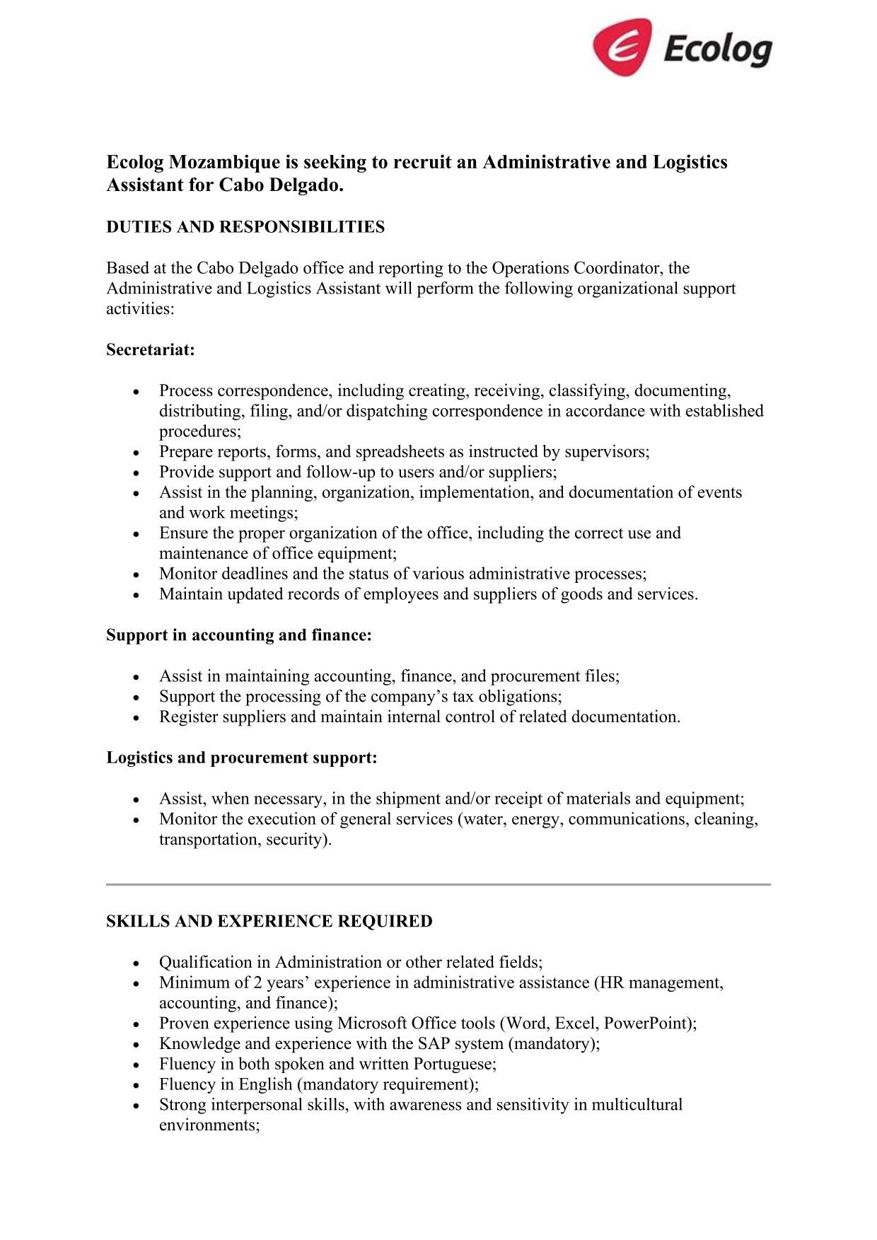 Ecolog Mozambique is hiring an Administrative and Logistics Assistant for Cabo Delgado (Pemba).