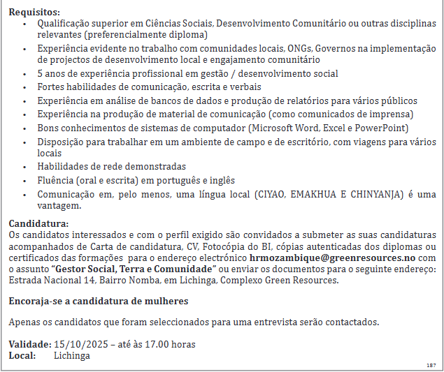 Os candidatos interessados e com o perfil exigido são convidados a submeter as suas candidaturas acompanhados de Carta de candidatura, CV, Fotocópia do BI, cópias autenticadas dos diplomas ou certificados das formações para o endereço electrónico [email protected] com o assunto “Gestor Social, Terra e Comunidade” ou enviar os documentos para o seguinte endereço: Estrada Nacional 14, Bairro Nomba, em Lichinga, Complexo Green Resources.