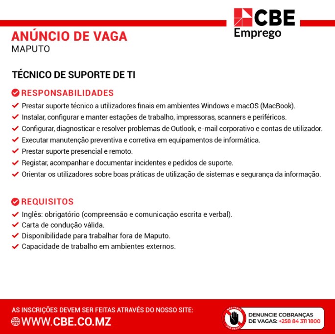 Candidaturas através do website: https://www.cbe.co.mz/jobs/tecnico-de-suporte-de-ti-end-user-helpdesk