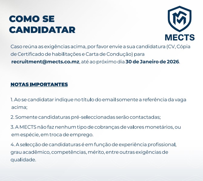 📌 Caso reúna as exigências da vaga, envie a sua candidatura (CV, Cópia de Certificado de Habilitações e Carta de Condução) para [email protected], até o dia 30 de de Janeiro de 2026.