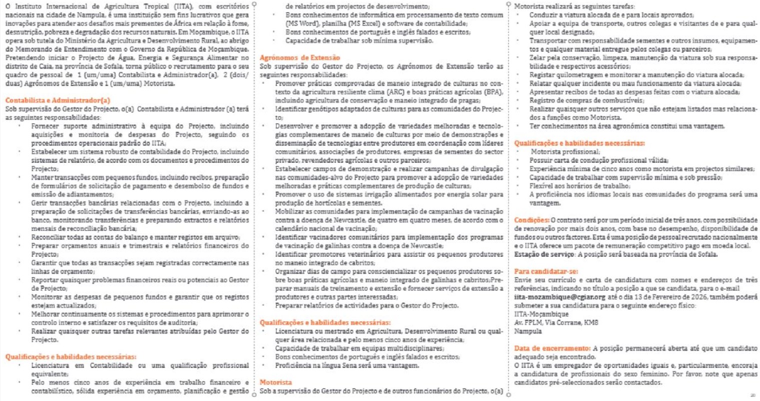 Pretendendo iniciar o Projecto de Água, Energia e Segurança Alimentar no distrito de Caia, na província de Sofala, torna público o recrutamento para seu quadro de pessoal de 1 (um/uma) Contabilista e Administrador(a), 2 (dois/duas) Agrónomos de Extensão e 1 (um/uma) Motorista.